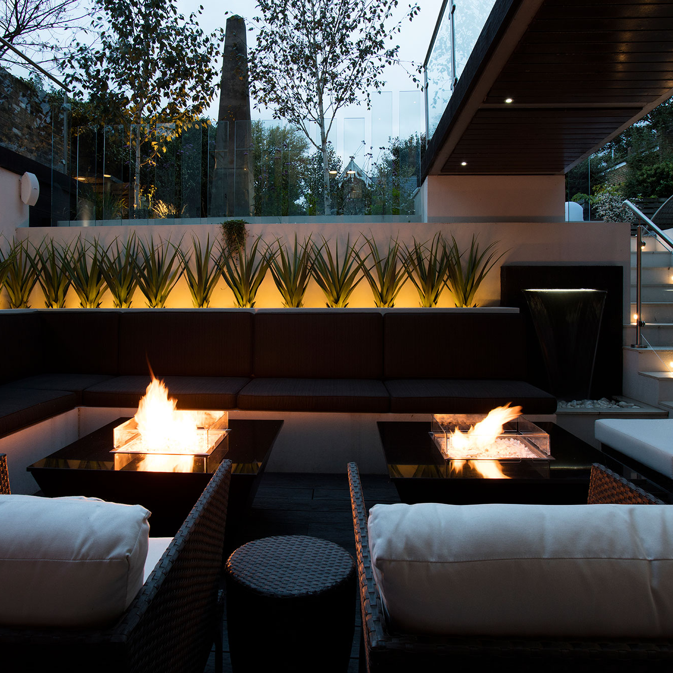 As the client travels frequently for business, the landscape was designed to be relatively low maintenance, combining carefully selected planting with artificial elements to ensure the garden remains structured and visually appealing throughout the year.