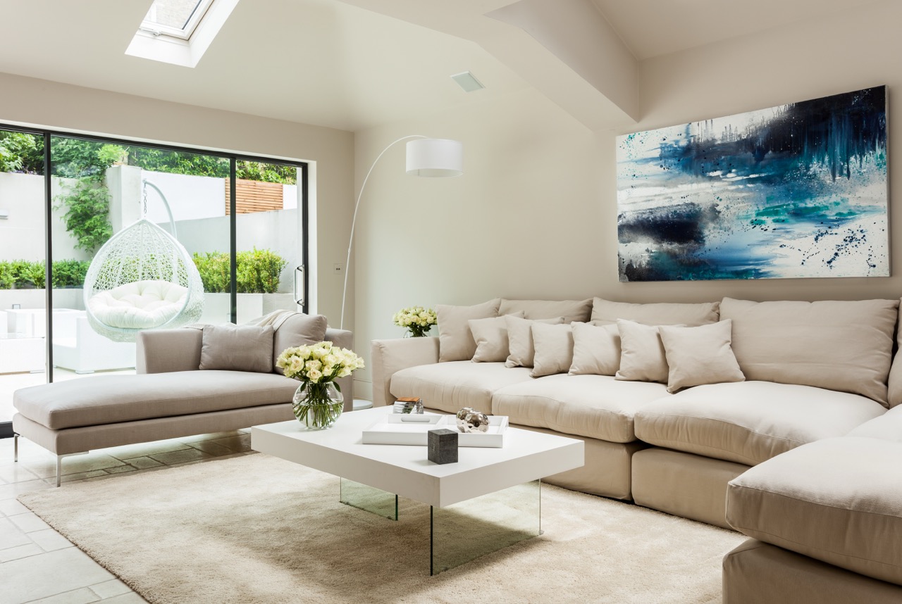 White upholstery, soft textiles and natural materials create a sense of calm continuity throughout the house, while blue accents - in fabrics, artwork and detailing -